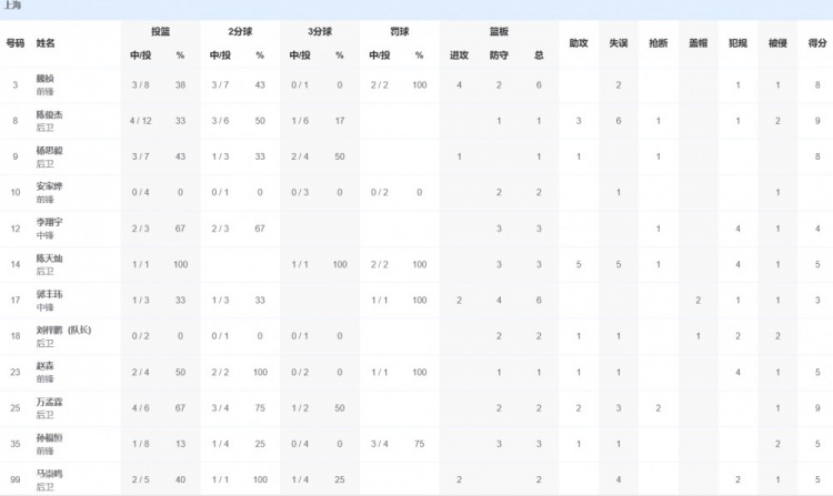 上海隊(duì)方面,萬孟霖9分2籃板2助攻2搶斷,陳俊杰9分3籃板1助攻,魏楨8分6籃板。