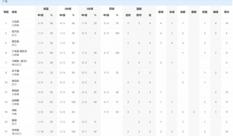廣東隊(duì)方面,李奕臻18分5籃板2助攻2搶斷,袁照耀17分4籃板1助攻,王浩然14分4籃板4助攻1搶斷,徐昕11分5籃板1助攻3搶斷2蓋帽。