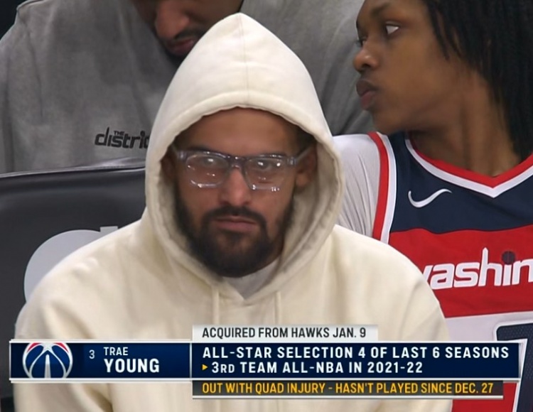 奇才新援特雷·楊場邊觀戰(zhàn)。